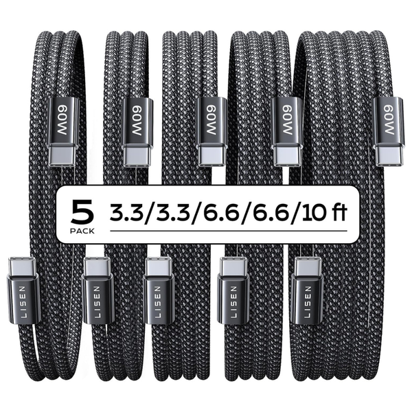 5-Pack Lisen 60W USB-C Braided Charger Cables (3.3/3.3/6.6/6.6/10 ft)