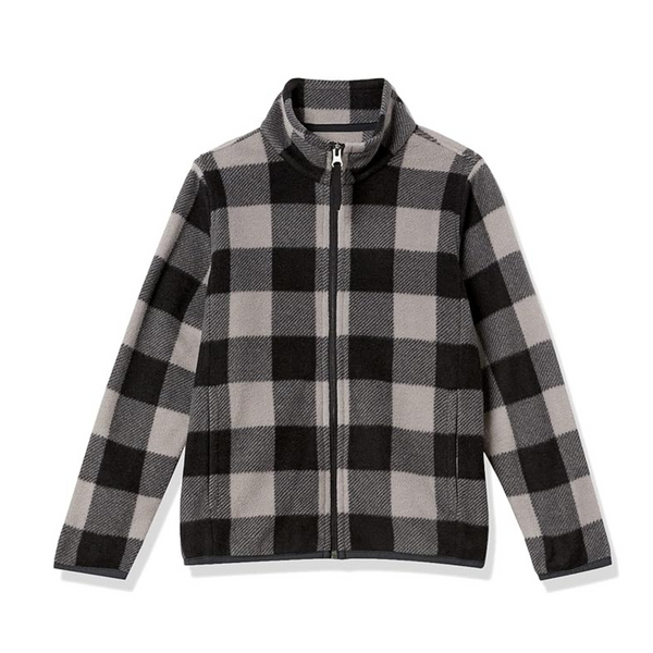 Amazon Essentials Boys' Polar Fleece Full-Zip Mock Jacket (Black Grey Buffalo Check)