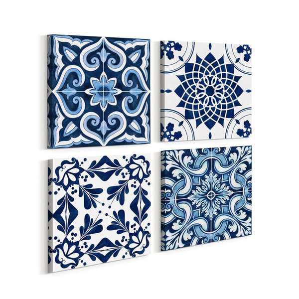 Set of 4 Jrhung (12" x 12") Modern Blue Tile Pattern Canvas Wall Art